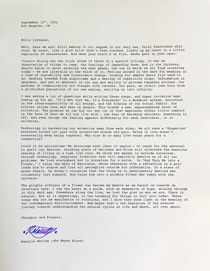 Natalie Mering has announced a new Weyes Blood album called And In The Darkness, Hearts Aglow, her follow-up to 2019's Titanic Rising. She co-produced it primarily with Foxygen's Jonathan Rado, and it features guest appearances from Meg Duffy, Daniel Lopatin, and Mary Lattimore.