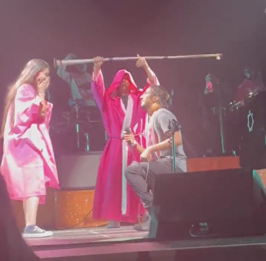 A couple got engaged onstage last night at Gorillaz' World Tour 2022 date at the Moody Center in Austin, Texas. Feel Good Inc., indeed! Also, spoiler: She said yes. Afterwards, lead singer Damon Albarn — dressed in a hooded pink robe — blessed the union with a giant vuvuzela. Love is real, folks. Watch the moment take place below via some fan-shot video.