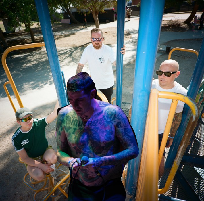Stereogum descended upon Desert Daze last weekend on the shores of Lake Perris in Southern California. The sights were gorgeous — more music festivals should be held alongside immaculately speckled mountain ranges and sparkling bodies of water — and the sounds were similarly stimulating. A great time was had by all (and a grate time by some). We've posted about our experiences with the newfangled Black Country, New Road and the oldfangled(?) Tame Impala, and we'll have more from Desert Daze soon. In the meantime, check out Wilson Lee's lovely portraits of performers from the psych-leaning fest. Sebastian from Viagra Boys wasn't feeling well, so we Photoshopped him into their portrait.