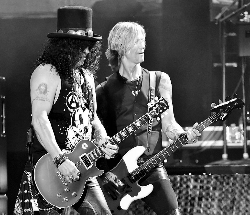Last year, Guns N' Roses released two new songs, "ABSUЯD" and "Hard Skool." These were the first new GN'R tracks since the 2008 would-be comeback album Chinese Democracy, and they were the first recorded with returning members Slash and Duff McKagan since The Spaghetti Incident?, their 1993 covers album. But they weren't really new songs. "ABSUЯD" was a version of "Silkworms," a song from the Chinese Democracy sessions that the band had been playing live back in 2001, and "Hard Skool" also dated back to the Chinese Democracy sessions. But now Slash says that the band is currently working on new music and that some of their songs are "epic."