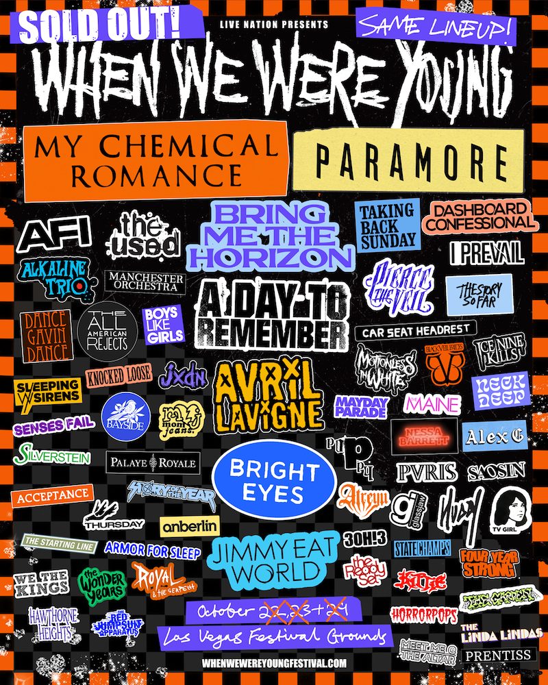 Announced last January, When We Were Young features Chemical Romance and Paramore as headliners. The lineup also includes Bright Eyes, AFI, the Used, Bring Me The Horizon, Taking Back Sunday, Dashboard Confessional, Alkaline Trio, Manchester Orchestra, Dance Gavin Dance, the All-American Rejects, Avril Lavigne, Thursday, Anberlin, 3OH!3, Atreyu, Jimmy Eat World, La Dispute, the Wonder Years, Hawthorne Heights, Car Seat Headrest, Wolf Alice, and more.