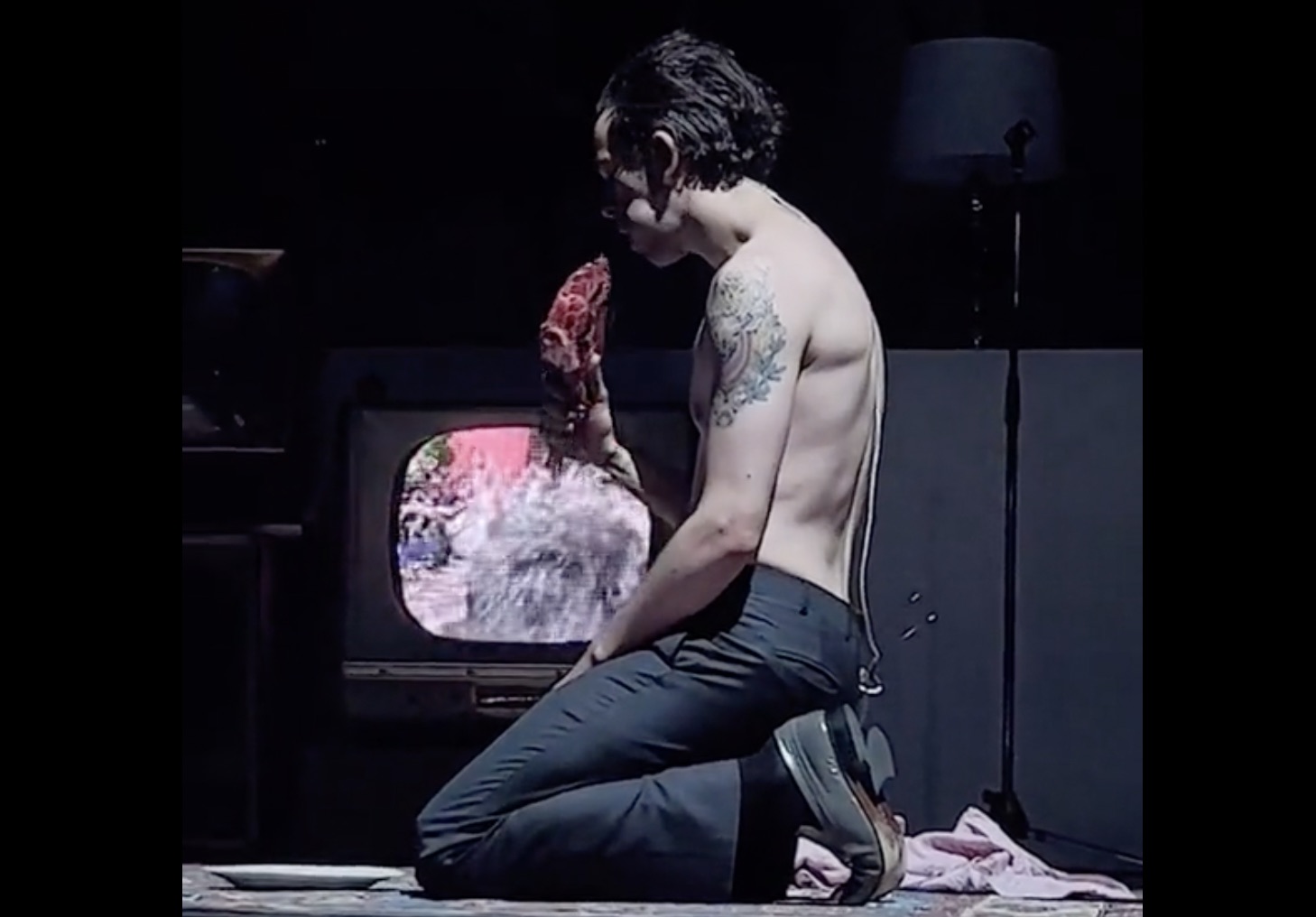 During last night's show, a shirtless Matty Healy got down on his knees as dramatic string music played. A stagehand brought out a plate of raw meat, and Healy proceeded to take a couple of big chomps out of it. While Healy chewed, he dramatically grabbed his own nuts and then did some pushups. Then he crawled into a TV. Look, I don't fucking know, I'm just telling you what happened. You can watch it for yourself below.