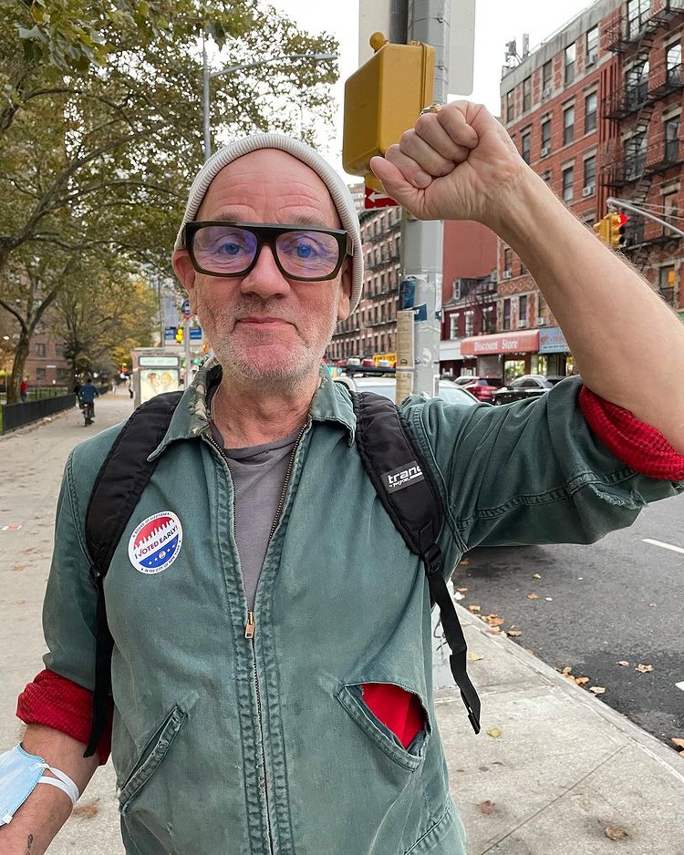 Today, on this highly stressful 2022 midterms elections day, R.E.M.'s Michael Stipe is back after a four-year social-media hiatus to remind people to vote. In fact, that's what he wrote in his newly resurrected Instagram bio: "I am back after a 4yr hiatus from all social media to urge every American to vote today...Thanks!" Stipe also shared one post containing three photos of himself walking through New York with a fist aloft and an "I Voted" sticker on his jacket. "Turnout—YOUR VOTE—is what will most influence todays election results…if you are in line to vote, don’t be discouraged—your voice matters!! Raise it high!!!," he captioned. Patti Smith even replied in the comments: "Awesome. Joining forces with you." As should we all.
