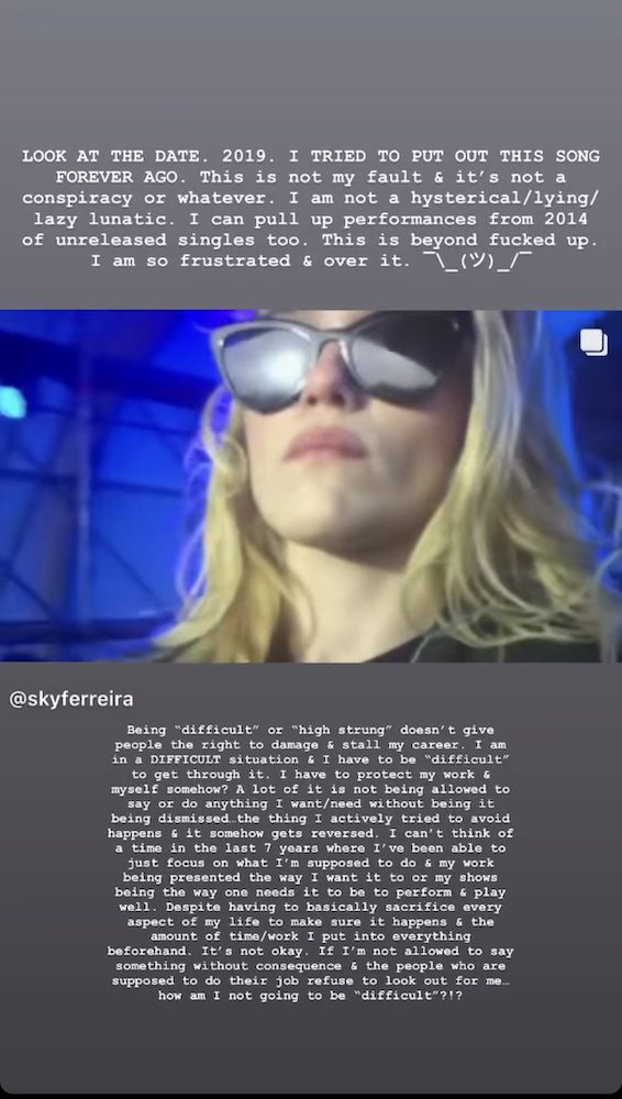 Posting to her Instagram, Ferreira shared a clip of a new song with the words overlaid, "I WANT TO PUT THIS OUT." Ferreira then elaborated on her Stories, writing, "LOOK AT THE DATE. 2019. I TRIED TO PUT OUT THIS SONG FOREVER AGO. This is not my fault & it's not a conspiracy or whatever."