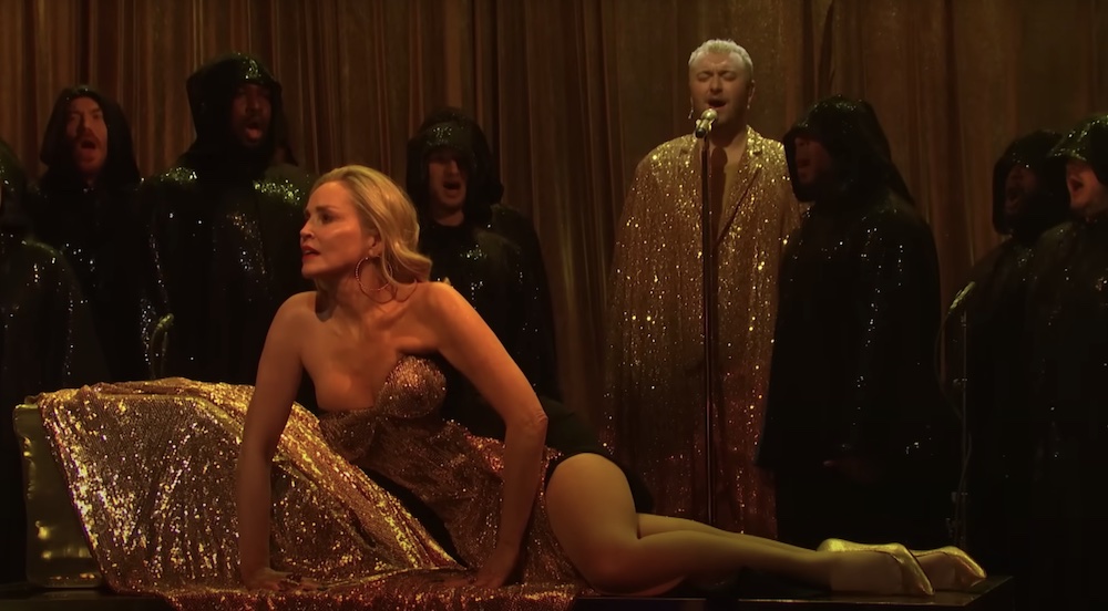 Sharon Stone popped up in their performance for the recently-released single "Gloria," laying down for most of the time while Smith sang amidst a crew of sparkly hooded figures. This was Stone's first appearance on the show in over three decades -- she acted as host in April 1992, shortly after Basic Instinct was released. Stone also popped up in the night's final sketch ("Film Noir").
