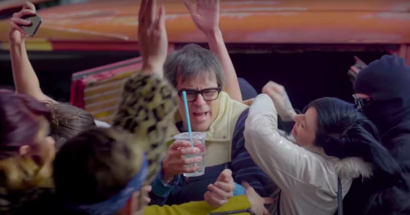 Today, Fall Out Boy released "Heartbreak Feels So Good," the second single from So Much (For) Stardust. In the song's video, the band attempts to stage a stunt: a planned kidnapping of River Cuomo. (Cuomo's band Weezer played the Hella Mega Tour with Fall Out Boy last year.) But Cuomo doesn't want to be fake-kidnapped, so he sends a mob of screaming fans after Fall Out Boy, which leads to the band fighting bikers, jumping off rooftops, and driving a fan through a cake.
