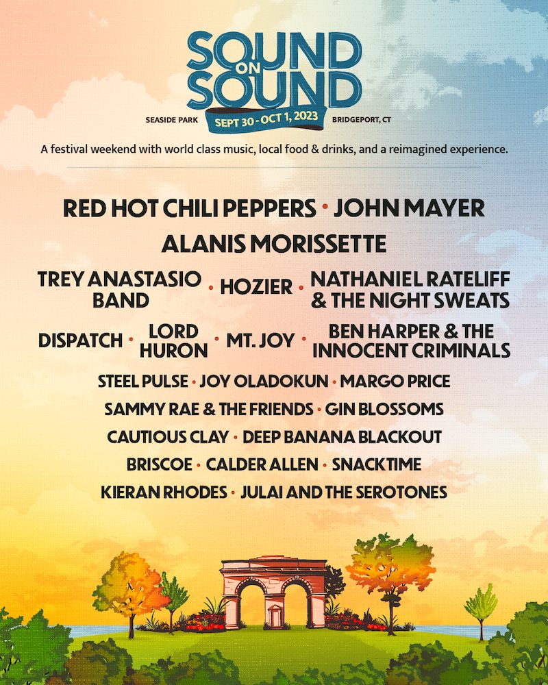 Sound On Sound Festival, taking place Sept. 30 through Oct. 1 at Seaside Park in Bridgeport, Connecticut, will return for its second annual edition with headliners Red Hot Chili Peppers, John Mayer, and Alan's Morissette. Additional performers will include: Trey Anastasio Band, Hozier, Nathaniel Rateliff & The Night Sweats, Lord Huron, Dispatch, Ben Harper & The Innocent Criminals, Mt. Joy, Steel Pulse, Joy Oladokun, Margo Price and more.