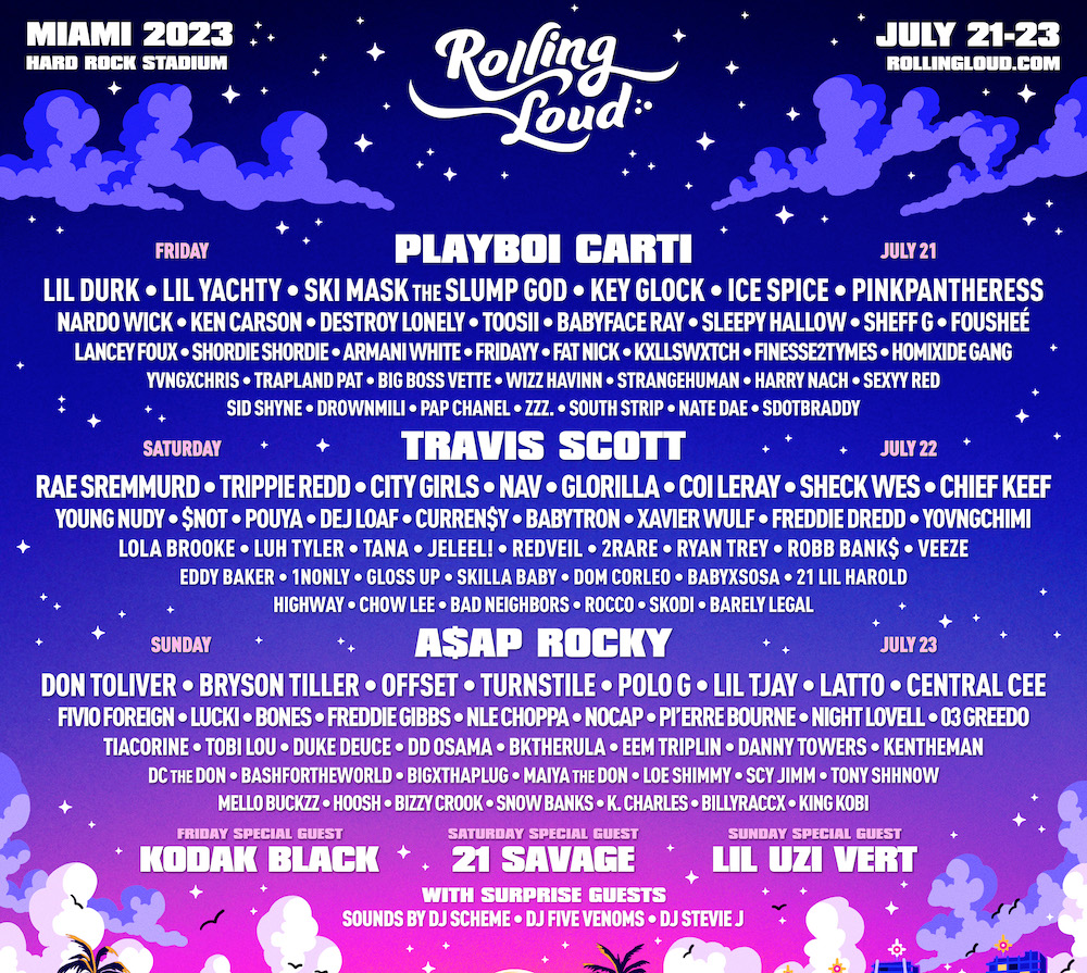 Rolling Loud has become a gigantic brand name over the past few years, and the festival has expanded into a bunch of different cities. But the annual Miami festival is still the flagship, and now that festival has unveiled its lineup. This year's Miami festival goes down 7/21-23 at Miami's Hard Rock Stadium, and its lineup of headliners is basically what you'd expect, with the slight caveat that it's still a little shocking to see Travis Scott at the top of a festival bill. Travis Scott will share those headliner duties with Playboi Carti and A$AP Rocky, and the bill also features giant-font "special guests" 21 Savage, Lil Uzi Vert, and Kodak Black. Nobody's getting cancelled for anything anymore.