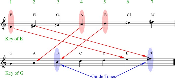 As we can observe above in Figure 5, the fundamental (1, 4, and 5) scale degrees in E Major are also present in G Major. Further, we can find G Major’s harmonically vital guide tones (3 and 7) in the key of E Major. So when pivoting the harmonic axis to this unrelated key center, we hear that there’s still some tonal glue holding them together. But E Major and G Major do sound jarringly disconnected because the former’s guide tones don’t survive the key change to the latter. (The notes G# and D# don’t live comfortably in G Major — at least, not in the “Ionian” mode Def Leppard is using here.) Indeed, it's the specific common and differentiated notes that makes this particular modulation so evocative. And it’s why the key change in the pre-chorus of “Photograph” creates such a commanding lift.
