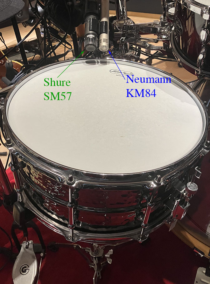 The drum sound you hear on "Photograph" maintains the colossal size and depth of field you hear on “Let It Go,” but there’s a notable difference: On "Photograph," the drums sound even bigger and they’re all programmed, not played. To maintain maximum flexibility, they sampled a number of snare and kick drums into the Fairlight CMI audio workstation and programmed Rick Allen’s drum patterns. The enormous backbeat you hear on “Photograph” resulted from layering, pitching down, and processing a variety of superimposed snares — most notably the Ludwig Black Beauty. This drum happens to the most-recorded snare in history (for heavy rock music), and for good reason: It has an extremely wide tuning range and it cuts through dense mixes easily. Mike Shipley and Mutt Lange captured the sound using a combination of the venerable Shure SM57 (for the mid-range) and the Neumann KM84 (for the highs and lows). See Figure 8 below.
