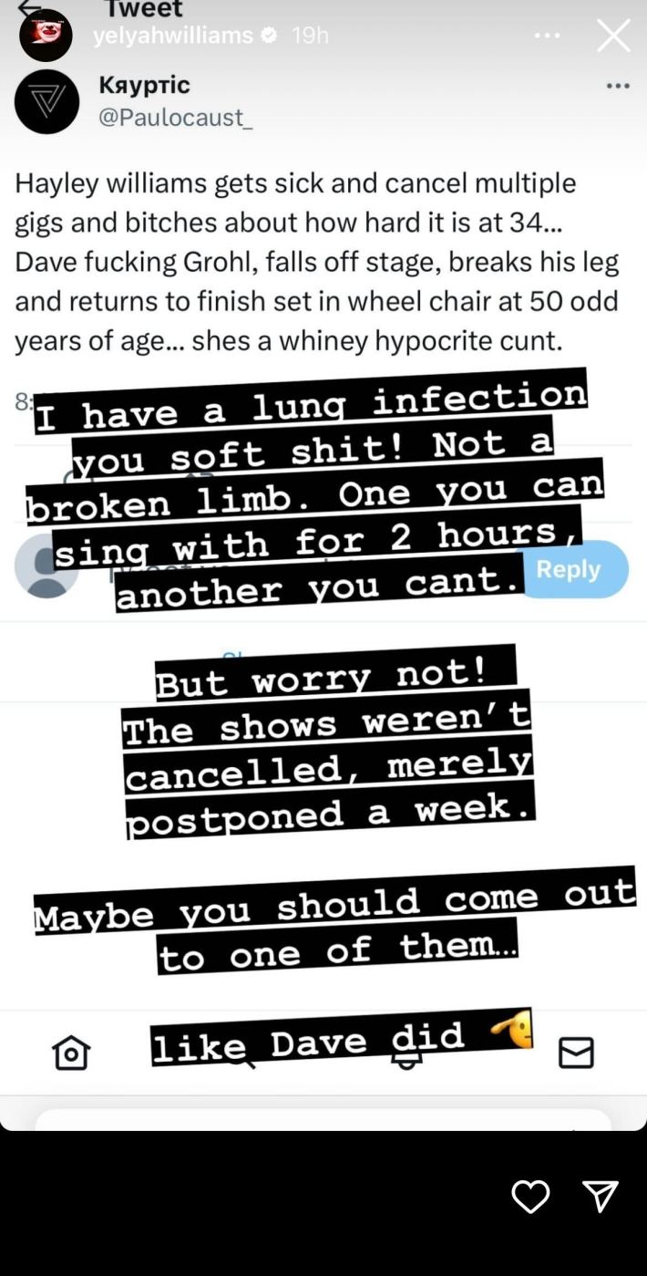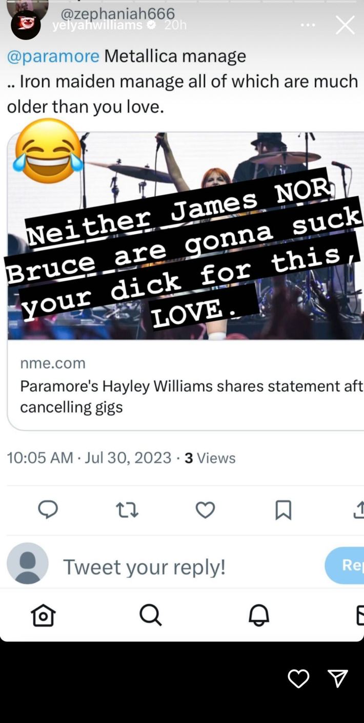 Paramore have already picked back up their tour -- they performed in Tulsa on Saturday night and St. Louis on Sunday. And yesterday Williams took to her Instagram story to respond to some internet criticism she saw about their brief tour postponements. In one tweet that she posted a screenshot of, a random person said that both Metallica and Iron Maiden "manage" ... "all of which are much older than you love." Williams responded with: "Neither James [Hetfield] NOR Bruce [Dickinson] are gonna suck your dick for this, LOVE."