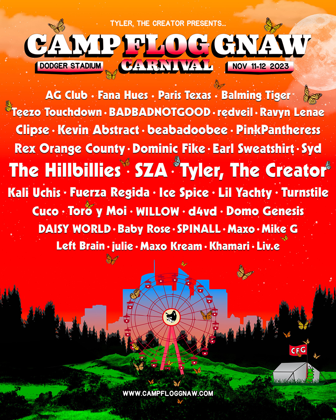 Camp Flog Gnaw Carnival, the music festival headed up by Tyler, The Creator, is returning this November 11 and 12 at Dodger Stadium in LA. Tyler hasn't staged the festival since 2019 due to COVID, but it's coming back in a big way for 2023. In addition to Tyler himself, headliners include SZA and "The Hillbillies," which presumably means Kendrick Lamar and Baby Keem. Also on the bill: Earl Sweatshirt, Clipse, Ice Spice, Turnstile, beabadoobee, Kali Uchis, Lil Yachty, PinkPantheress, Kevin Abstract, Toro y Moi, Liv.e, and many more. They got both Maxo and Maxo Kream. The fest is already sold out, but you can get more info on it here.