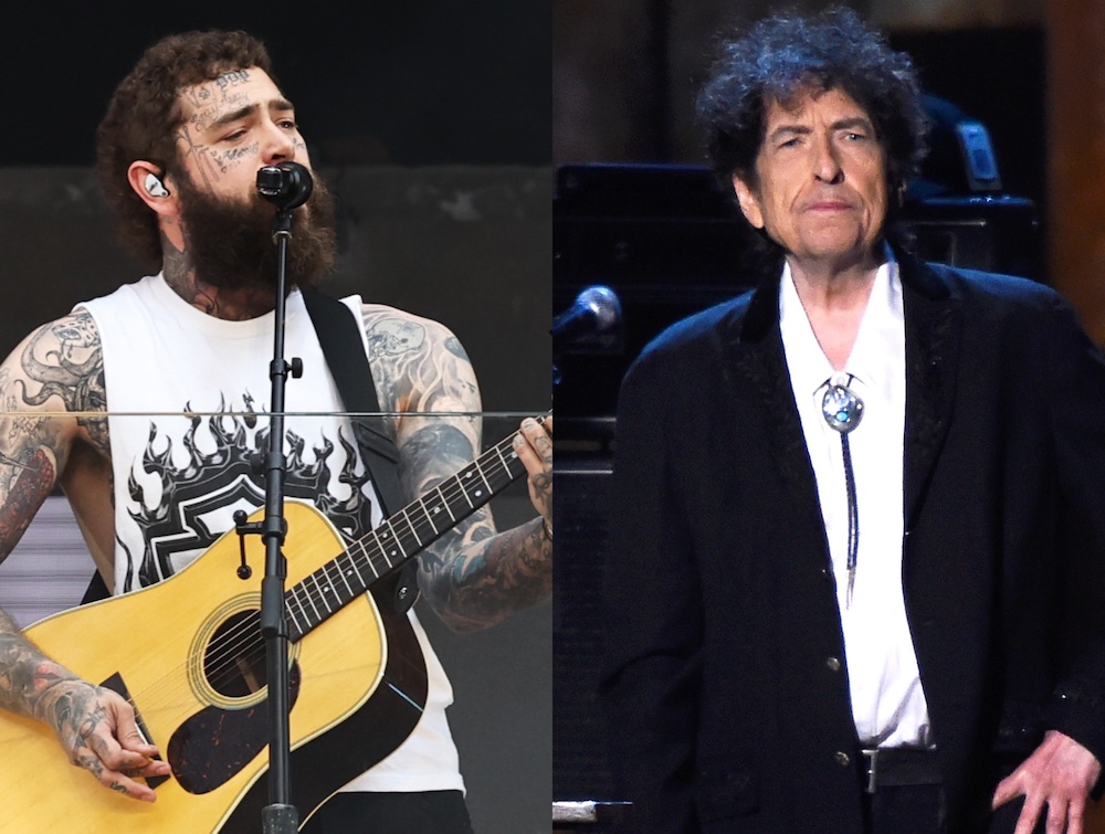 There currently exists an unfinished Post Malone song with Bob Dylan lyrics. In a Rolling Stone report, producer Michael Cash talks about how he'd wanted Malone to appear on a collection of Dylan songs inspired by the 2014 T Bone Burnett-produced album Lost On the River: The New Basement Tapes. Cash wanted to create an album featuring songs by rappers, such as Kendrick Lamar, J. Cole, and Malone, who is a known Dylan fan. (Before he became famous, Malone uploaded a cover of "Don't Think Twice, It’s All Right" to YouTube in 2013, and he currently has a tattoo of Dylan playing the harmonica on his left bicep.)