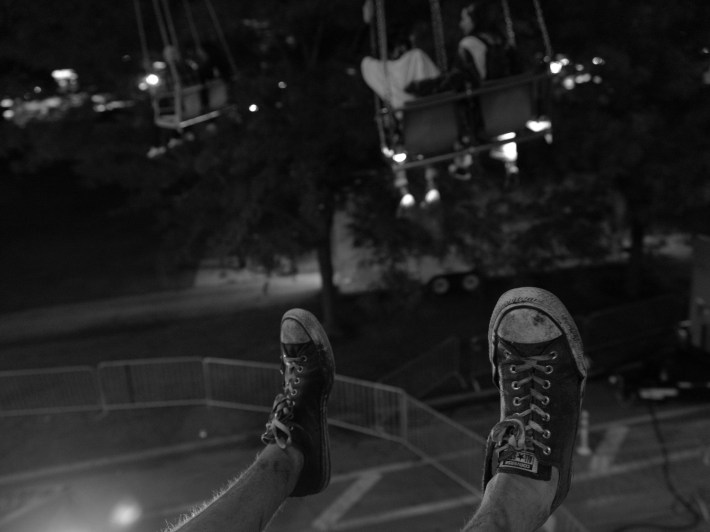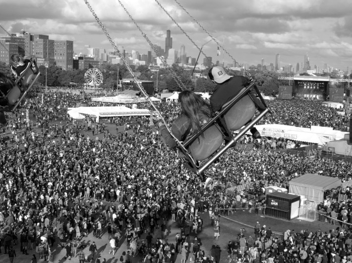 Riot Fest has all these amusement park rides around the field this year. There's a big-ass ferris wheel. A vomit comet. A merry go round. She wants to go on one tonight and take some god's eye shots of the festival, but I'm not into it. Probably super expensive. She can go by herself another day.