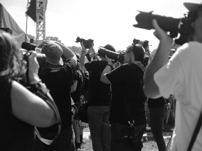The 30s-ish woman very sweetly asks if me and Danielle are twins. I'm flattered. My sister looks horrified. That's fair. I've got a few years on her; she's still a senior in college, younger than pretty much anyone else here with a camera strapped to them. Danielle's department at GW leant her the Bond-movie-briefcase-bomb-looking thing that rests on her sternum. A Fujifilm GFX 50R. Honestly, it's like twice the size of my sternum. Apparently an old photo dude in the Origami Angel pit yesterday told her she had the wrong lens on. Joke's on him and the rest of journalism. My sister's an actual artist. Or… at least… so she says.