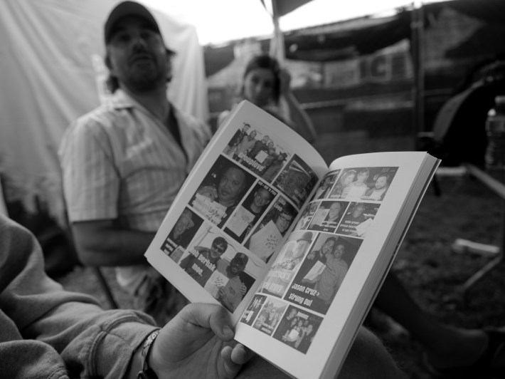"Think about it, though. Everybody here is selling something," he says, gesturing to the motley crue assembled around us beneath the hot Chicago sun. "The publicists are selling their clients, the musicians are selling their art, the label people are selling stock, the Riot Fest photo people are selling Riot Fest, you guys are selling your journalism. But I'm giving these books away for free. This is pure passion."