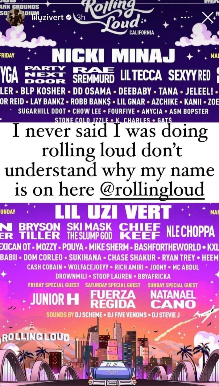 On Tuesday, the Rolling Loud California lineup for next year was revealed, with Nicki Minaj, Post Malone, and Lil Uzi Vert headlining. However, Lil Uzi Vert made a post on his Instagram Story shortly after the announcement, writing, "I never said I was doing rolling loud don't understand why my name is on here."