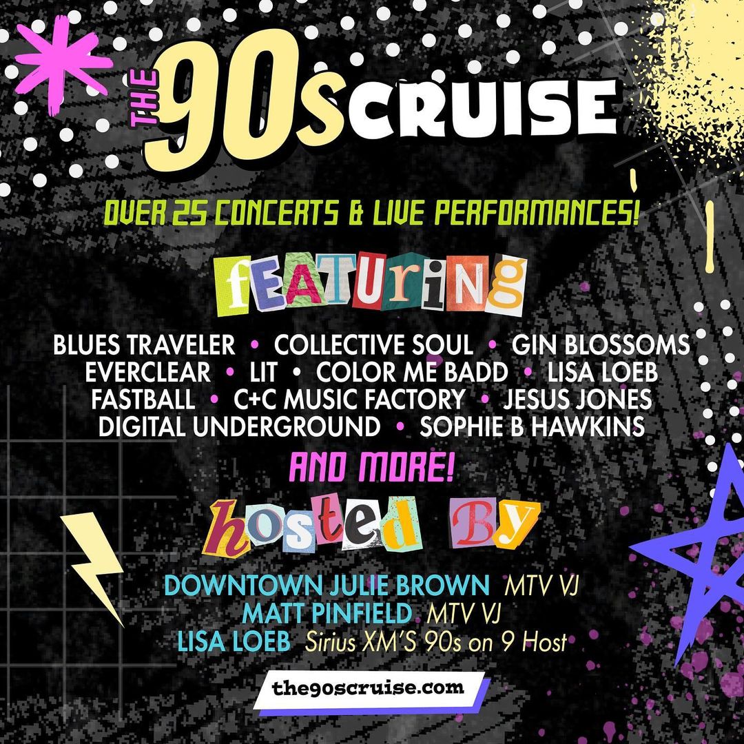 By the winter of 2025, we'll be a full quarter-century away from the 1990s — exactly the right amount of time for the '90s nostalgia summer tour market to morph into a '90s nostalgia concert cruise market. That's when the simply and directly named '90s Cruise will set sail. On deck for the maiden voyage will be Blues Traveler, Collective Soul, Gin Blossoms, Everclear, Lit, Color Me Badd, Fastball, C+C Music Factory, Jesus Jones, Digital Underground, Sophie B. Hawkins, and Lisa Loeb, who'll be pulling double duty as host and performer. Former MTV personalities Downtown Julie Brown and Matt Pinfield will also be on board as hosts.