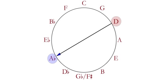Referring back to Figure 1, we can view the range of chord possibilities relating to our key center — incorporating "modal interchange" between D natural minor, D harmonic minor, and D Dorian. Do you find an A♭ anywhere? Neither do I. When we hear the A♭ Major "intruder" (voiced as an A♭Maj7♭5), it comes as a surprise because it's the most distant chord possible and it arrives without warning. The note A♭ is not only the farthest away (chromatically) from the note D, but a chord built on A♭ is also at the opposite end of the circle of fifths relative to D. The two chords are completely foreign to each other. [If you're unfamiliar the circle of fifths: it's a way musicians can organize the 12 chromatic pitches used in Western tonal music — kind of like how scientists use the periodic table to organize elements. The farther away one key center is from another, the less they have in common.] See Figure 5 below.