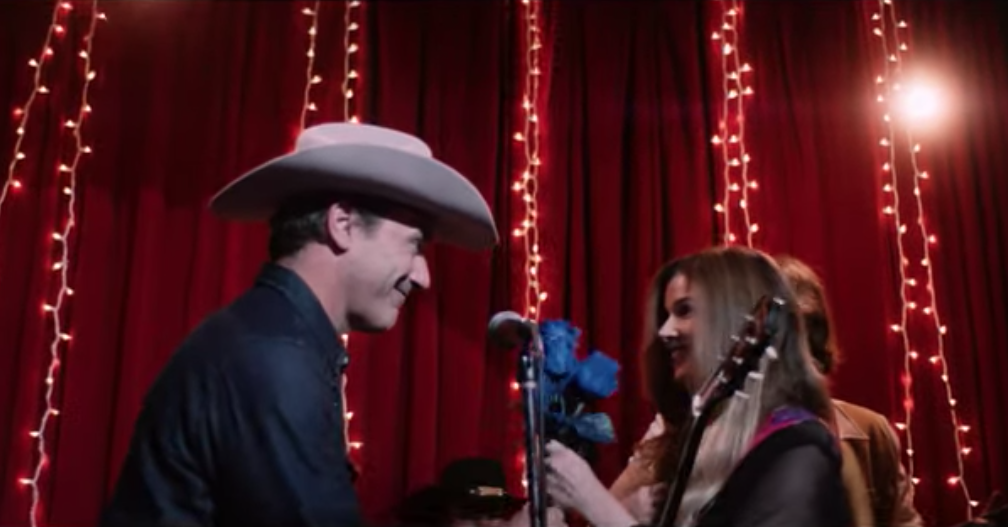 That's what we see in country singer Leslie Stevens' new video for "Blue Roses," a ballad from the new self-titled album she's announcing today. Not that Hamm's character here is entirely noble. In the video, directed by Paige Stark from Tashaki Miyaki, Hamm flirts with various women in the bar where Stevens is performing, then makes his way to the stage, hands Stevens a bouquet of blue roses, and hijacks her microphone. The content of his character remains... ambiguous, but stealing the spotlight like that is certainly an asshole move. I guess this dude is a little bit Roy Tillman, a little bit Don Draper?