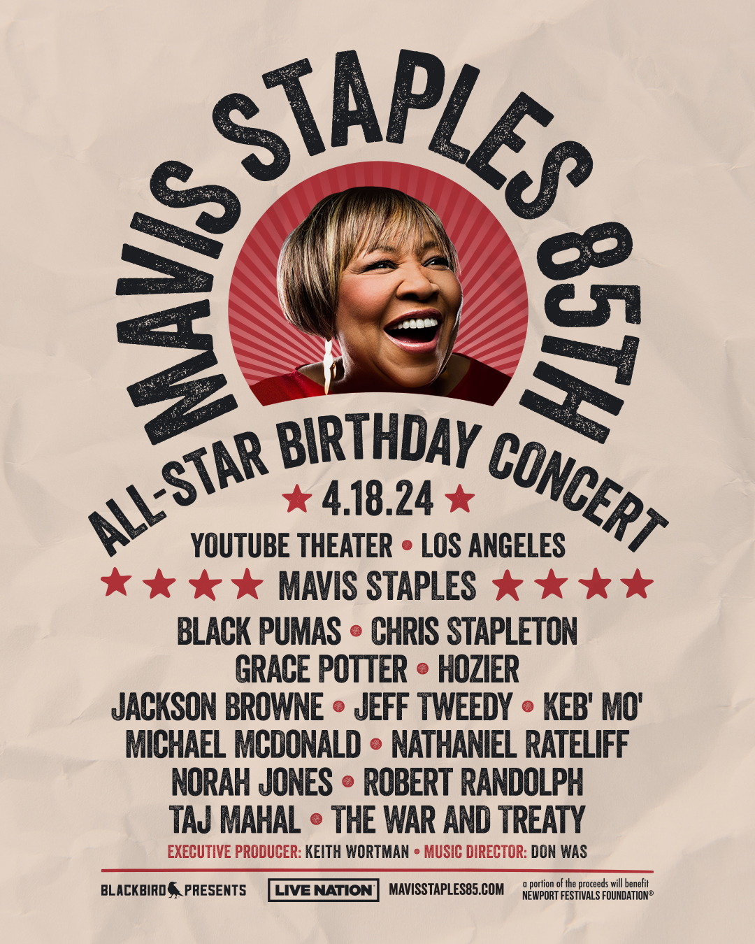 The show, going down April 18 at the aforementioned YouTube Theater in Los Angeles, has a lineup situated at the intersection of prestige retro soul and roots music. Besides Staples, friends of the site Black Pumas are the top-billed artist. Also on deck: Chris Stapleton, Grace Potter, Hozier, Jackson Browne, Jeff Tweedy, Keb' Mo', Michael McDonald, Nathaniel Rateliff, Norah Jones, Robert Randolph, Taj Mahal, and the War And Treaty. Presale tickets go on sale Tuesday with the password MAVIS85.