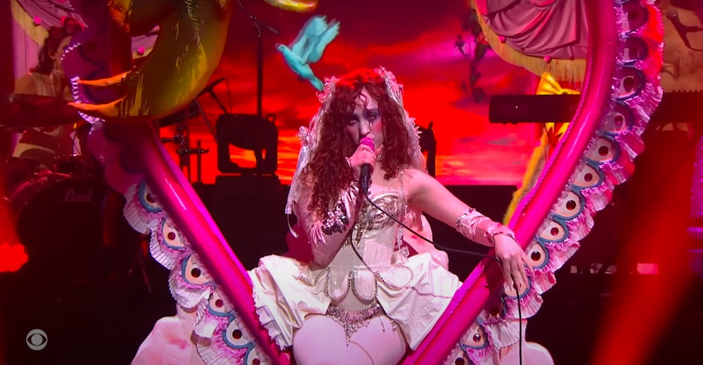 On Colbert, Chappell Roan sang her very catchy single "Red Wine Supernova" and nailed some big notes. But the music side of things seemed almost secondary. Roan went all the way over the top with her performance. She dressed in frilly bridal lingerie, sitting in a giant heart that was sitting on fluffy pink clouds, and she gave off silent-film-star energy.