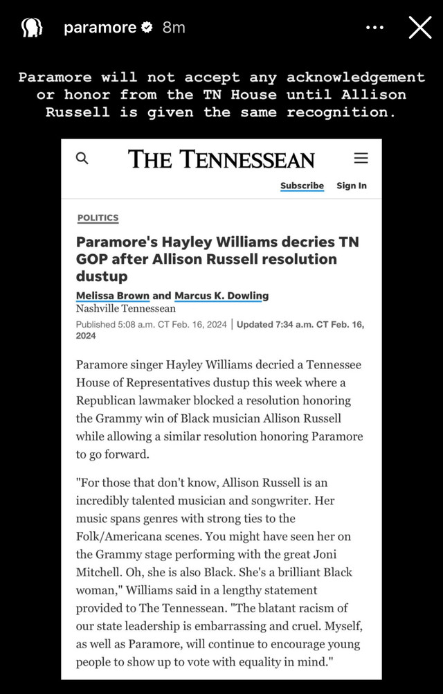 Additionally, on their Instagram story, Paramore write, "Paramore will not accept any acknowledgement or honor from the TN House until Allison Russell is given the same recognition."