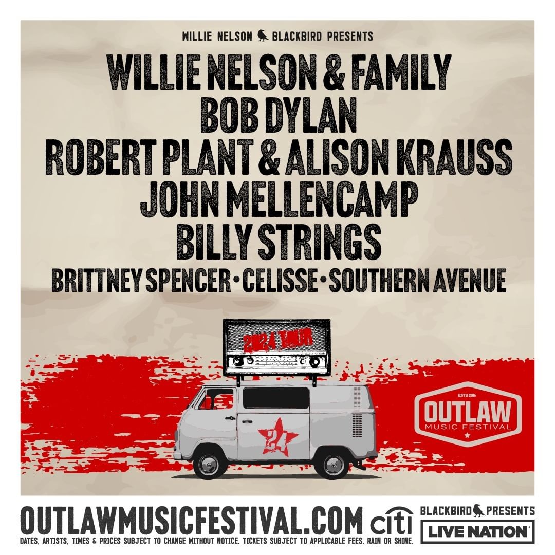 The Outlaw Music Festival has a rotating lineup, but this year's tour will feature Willie Nelson and Bob Dylan on every date. Robert Plant and Alison Krauss are also on board for many of the shows, as is John Mellencamp, which means you will get to see a whole lot of legends in one day. Americana superstar Billy Strings will also join the tour for one show at the Gorge in Washington, and Brittney Spencer, Celisse, and Southern Avenue are on board as openers. Below, check out the dates and lineups.