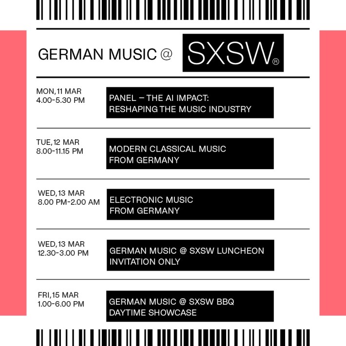 In addition to the music showcases German Music @ SXSW will also host an exclusive invitation-only luncheon at the Uptown Sports Club on Wednesday, March 13th. US music business professionals wishing to attend the Luncheon on March 13 can reach out to the project manager at max.domma@germanmusic-sxsw.com.