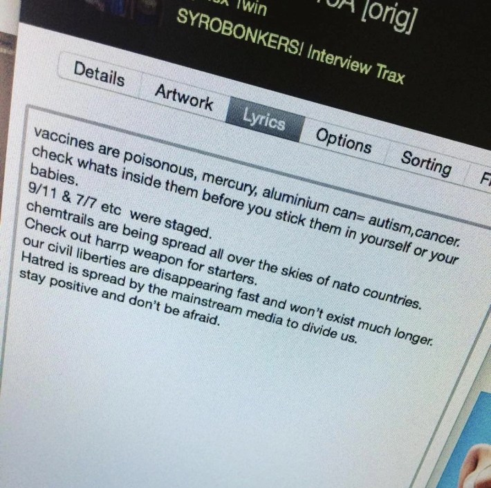 Earlier this week, a fan on Reddit posted a screengrab of an ID3 tag for a track ripped from Dave Noyze’s 2014 Syrobonkers interview with RDJ. It read: "vaccines are poisonous, mercury, aluminum can= autism, cancer." It also shared conspiracies about 9/11, Hamas, chemtrails, and more.
