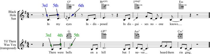 The above discussion of the B♮ in Cornell's melody over the Bb6b5 chord leads me to assume he composed the melody first without specific chords in mind, which he formulated later. The parallel melodic lines corresponding to the lyrics "in my mind / indisposed" are then developed/answered with the ensuing "in disguises no one knows" melody. What's the lineage of this melodic architecture?According to Superunknown producer Michael Beinhorn, Cornell wrote "Black Hole Sun" after marinating for some time in the Beatles and Cream, and after Beinhorn had tasked him with channeling those bands' music for some creative stimulation. The "Black Hole Sun" tune came to Cornell while driving in his car, and I wonder if he found inspiration, perhaps unknowingly, in the melody and progression of the Beatles' cover of "Till There Was You." The opening lines resemble each other in their construction, and the Major-6th chord at the top of the "Black Hole Sun" verses was a staple of the Beatles' music. See Figure 3 below.