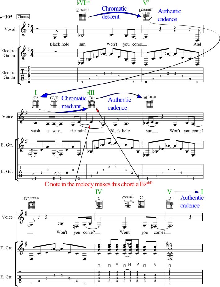 The chromatic descent in the chordal movement from F to Emin to Ebsus to D7 possesses its own kind of harmonic logic (chromatic motion has a way of justifying itself easily), even if each chord's function seems ambiguous. The D7 that ends the sequence is the V chord in G Major, which brings us back home in a Bach-approved V-I authentic cadence — one of the rare instances of conventional functional harmony in "Black Hole Sun." In essence, the "quasi-functional" harmonic system Cornell employed here manages to take seemingly unrelated chords comprising an utterly unpredictable pattern and weave them into a natural-sounding tapestry.