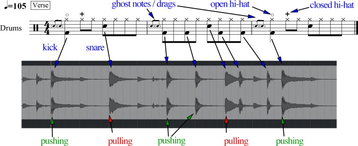 Every drummer has their own signature time-feel, and Cameron's tendency over the years has been to place the kick early or right on the grid in an assertive manner ("pushing") while delaying the snare backbeat slightly ("pulling"). This push-pull feel creates a driving sense of excitement and weight, and Cameron's copious use of drags and ghost notes imparts a kind of slinkiness to the groove. As you can see in Figure 6 above, the snare consistently falls slightly behind, which tends to make the song feel extra heavy.On Superunknown, Soundgarden didn't record to a "click" (i.e., a metronome), affording Cameron the leeway to bend the tempo from moment to moment, sculpting each dramatic turn. The fills going into each new section at times feel so late, they're almost like fermatas (prolonged rests). This imparts a sense of weight, but when the band starts cooking — particularly in the 9/4 section — the drums integrate a more agile feel. Sadly, most rock songs today are tethered to a metronomic grid for easy editing and "quantizing" (the process of moving notes in time to force a more robot-like precision). Hearing "Black Hole Sun" now makes me long for the lost nuance and musicality of click-free drumming.