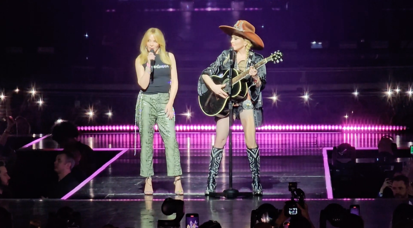 Madonna rose to pop icon status in the 1980s, and Kylie Minogue was just a few years behind her on that trajectory. But the two stars had never performed together until last night. When Madonna's Celebration Tour rolled into the Kia Forum in Inglewood, CA, Minogue joined her onstage. The pair did sort of a trailerized cover of Gloria Gaynor's disco classic "I Will Survive," then Minogue stuck around long enough for a quick a cappella run through her own classic "Can't Get You Out Of My Head." At one point in the show Madonna also questioned why one fan wasn't standing, but apologized when she realized the person was in a wheelchair. Watch footage of all that below.