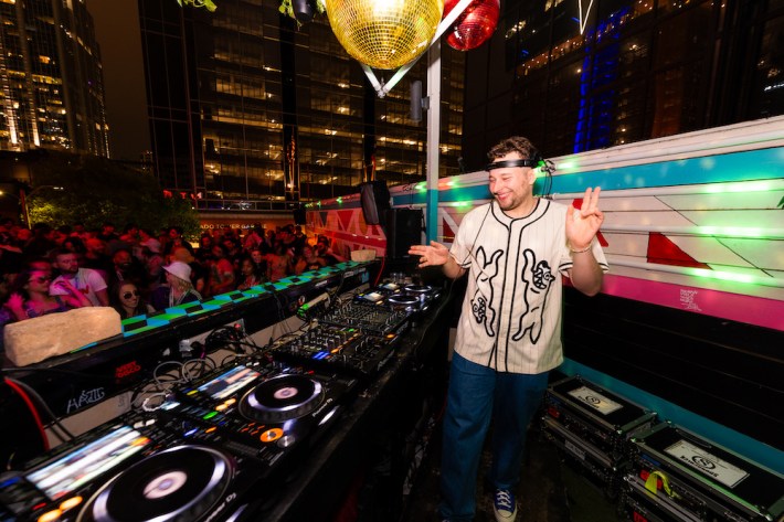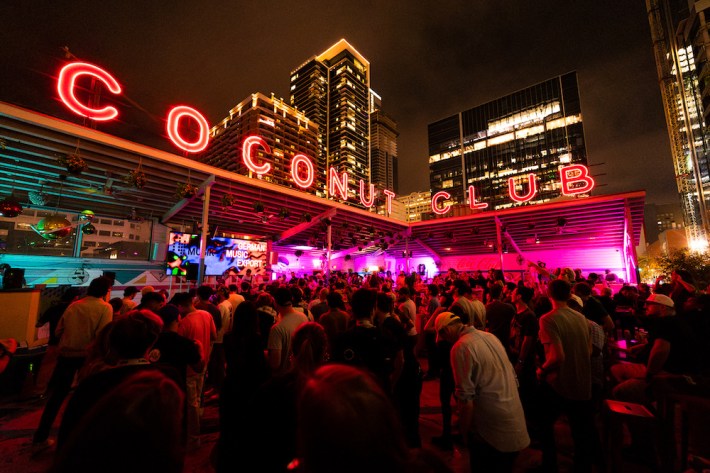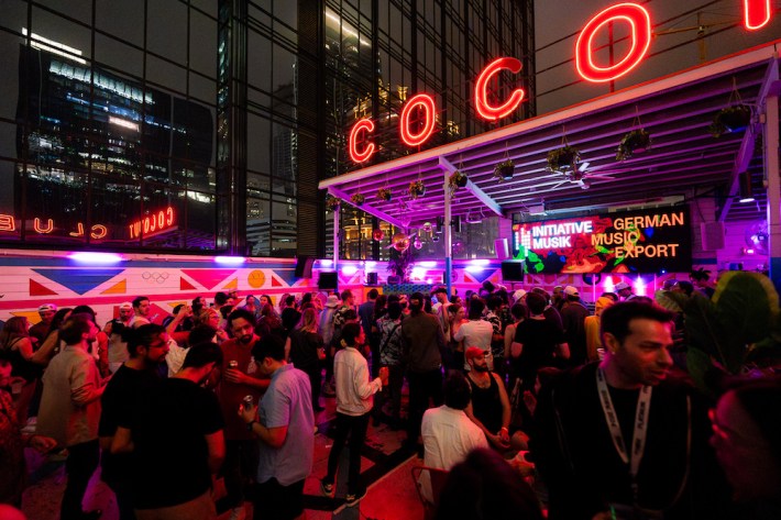 There was a soft humid breeze, neon lights blazed in every color of rainbow sherbet, and shiny industrial skyscrapers framed the second evening celebrating German music at SXSW 2024. This night was dedicated to electronic music, and on the main screen at the Coconut Club where German Music Export and Initiative Musik beamed their names, there were shifting thermographic-colored images of melting neon bunny faces, a floating grinning mouth, a kneeling couple facing each other. Though the crowd came and went, the dance floor was always full. "They’re German," a lanky baseball-capped man screamed to his friend as the opening duo Session Victim played. It was the complete opposite vibe to yesterday’s solemn, harrowing, and downright majestic event spotlighting classical music — think Matrix versus Spring Breakers.