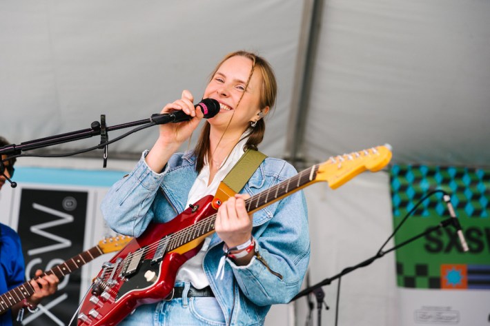 The bright, overcast afternoon began with Meagre Martin's earnest and funny indie pop. Their music felt like a cathartic breath which also validated the existential moral crisis that's hovered over the festival for the past week. The group showed their support for Palestine and solidarity for those suffering at the hands of war profiteers — one member wore a 'Free Palestine' shirt while another donned one that read 'End The U.S. War Machine.' Songs like "Please Clap" -- which they shared acme about from this incredibly awkward? inspiring? both? Jeb Bush moment -- and the upbeat cosmic cry "TBD (The Big Death) were among the highlights. "No I can't fake it," Sarah Martin began in guttural whisper during the verse. "The earth is shaking/ So I keep bracing."