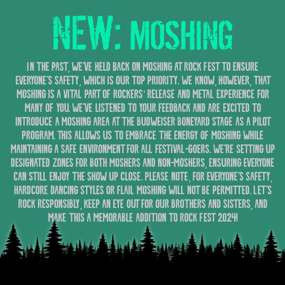 In the past, we've held back on moshing at Rock Fest to ensure everyone's safety, which is our top priority. We know, however, that moshing is a vital part of rockers' release and metal experience for many of you. We've listened to your feedback and are excited to introduce a moshing area at the Budweiser Boneyard stage as a pilot program. This allows us to embrace the energy of moshing while maintaining a safe environment for all festival-goers. We're setting up designated zones for both moshers and non-moshers, ensuring everyone can still enjoy the show up close. Please note, for everyone's safety, hardcore dancing styles or flail moshing will not be permitted. Let's rock responsibly, keep an eye out for our brothers and sisters, and make this a memorable addition to Rock Fest 2024!