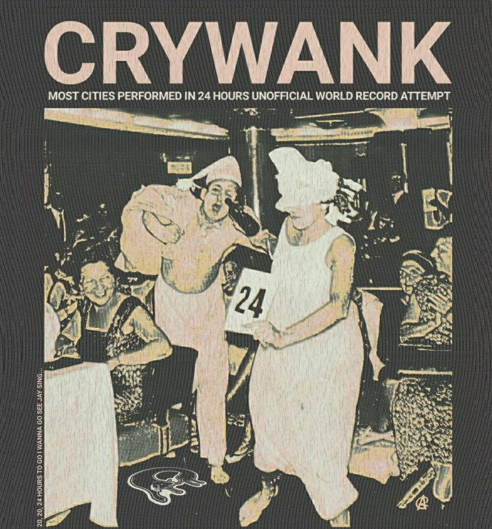Crywank managed to book the tour in three days, and it had free 20-minute sets all over the UK. Music Venue Trust — a UK registered charity which acts to protect, secure and improve grassroots music venues — then posted elaborate guidelines for the record on X, one of which asserted that the audience had to pay for admission. Crywank responded: "Awwww my gigs don’t count. Should’ve got a big corporate sponsor and charged all my fans for twenty minute shows, oh well." (Turner's tour was sponsored by the London taxi app FREENOW.)