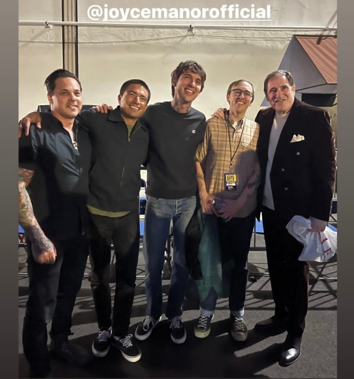 The episode also featured Joyce Manor, maybe the best current example of an LA punk band -- or, more accurately, a Torrance punk band -- at work. John Mulaney introduced them as "one of my favorite bands" and held up the Never Hungover Again album cover, and the band blasted through classic bashers "Constant Headache" and "Catalina Fight Song." Nobody moshed. Joyce Manor were the third Everybody's In LA musical guests, after St. Vincent on Monday and Warren G on Tuesday. The full performance isn't embeddable right now, but you can watch a moment of it below.