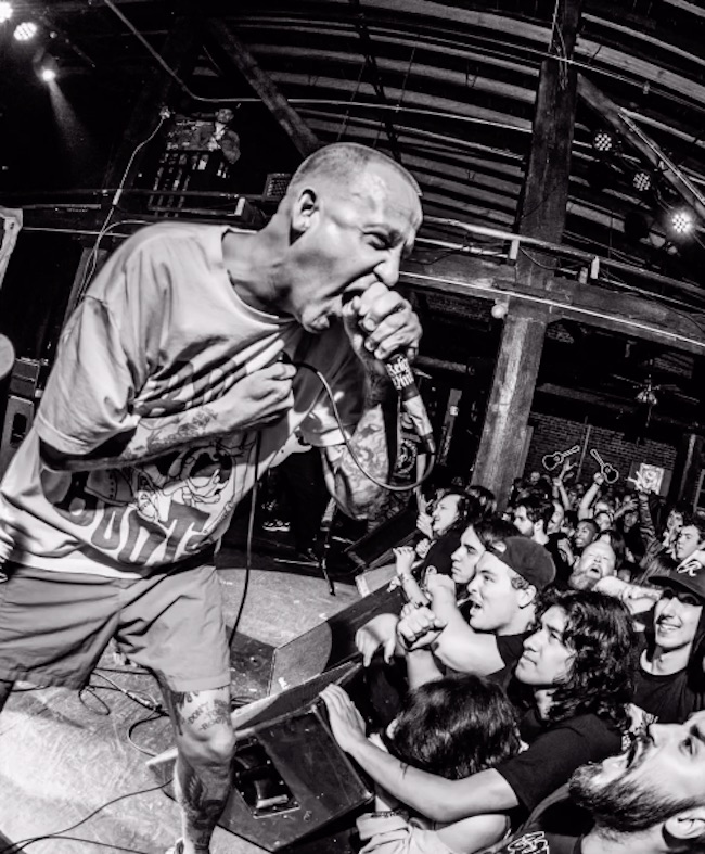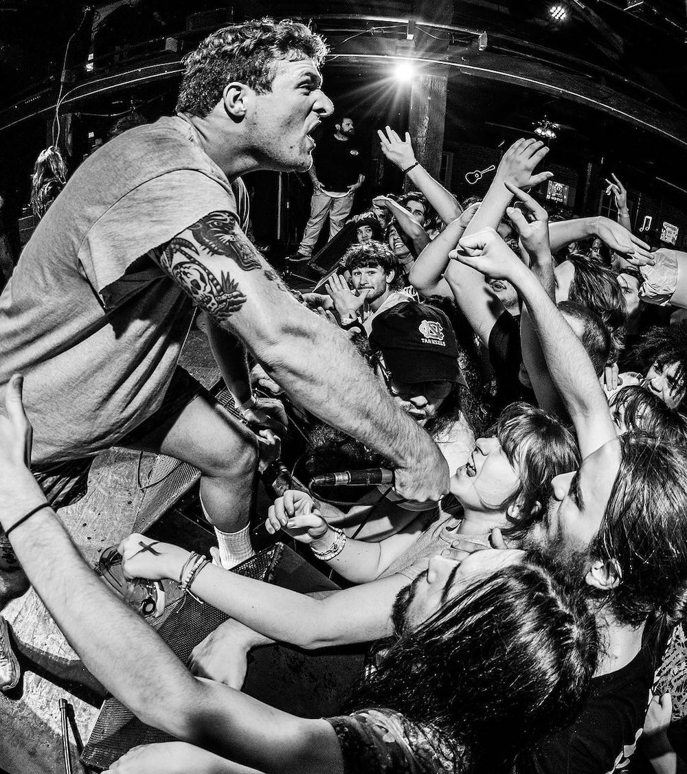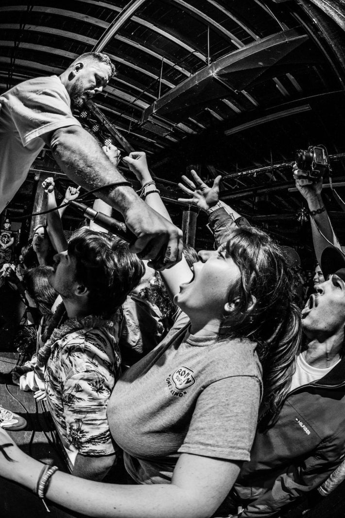 Onstage, Ciaramitaro is a total energy ball. He runs back and forth, he bounces, and he barks out constant instructions. He's not just demanding circle pits or side-to-side action. He's telling everyone in the room to lock arms and run over to the bar so that the people on that side of the room don't get left out. He's getting everyone to squat down and jump up at the same time. He's yelling: "Hands up! Hands up! 8 Mile! 8 Mile!" He's speaking to people who might be at their first hardcore show, telling them all about how much fun the culture is and how all these very different bands fit together. He's looking for people who know the words to the songs and then hucking the mic into the crowd underhand, like he's shooting a free throw in 1955.