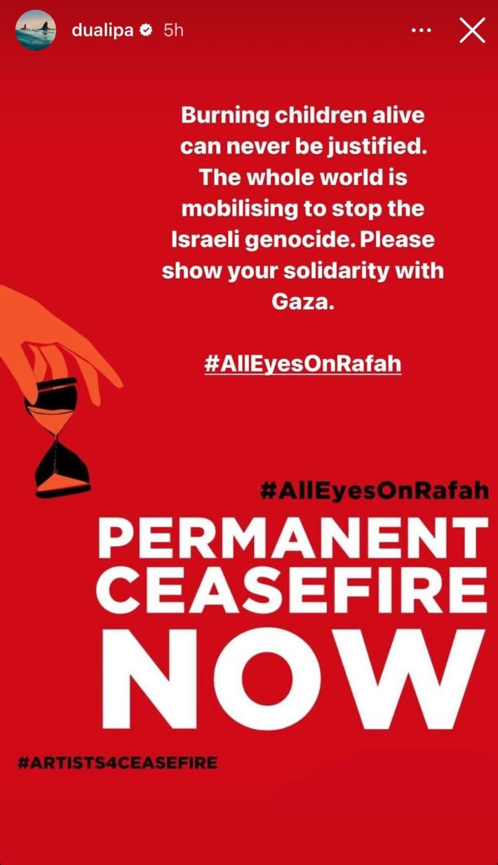 In October, Dua Lipa was one of many artists to sign an open letter urging President Joe Biden to call for a ceasefire in Gaza. She expounded on her political stance in her Rolling Stone cover in February, and today she posted a message on her Instagram Story advocating for an end to Israel's ongoing genocide of Palestinian people.