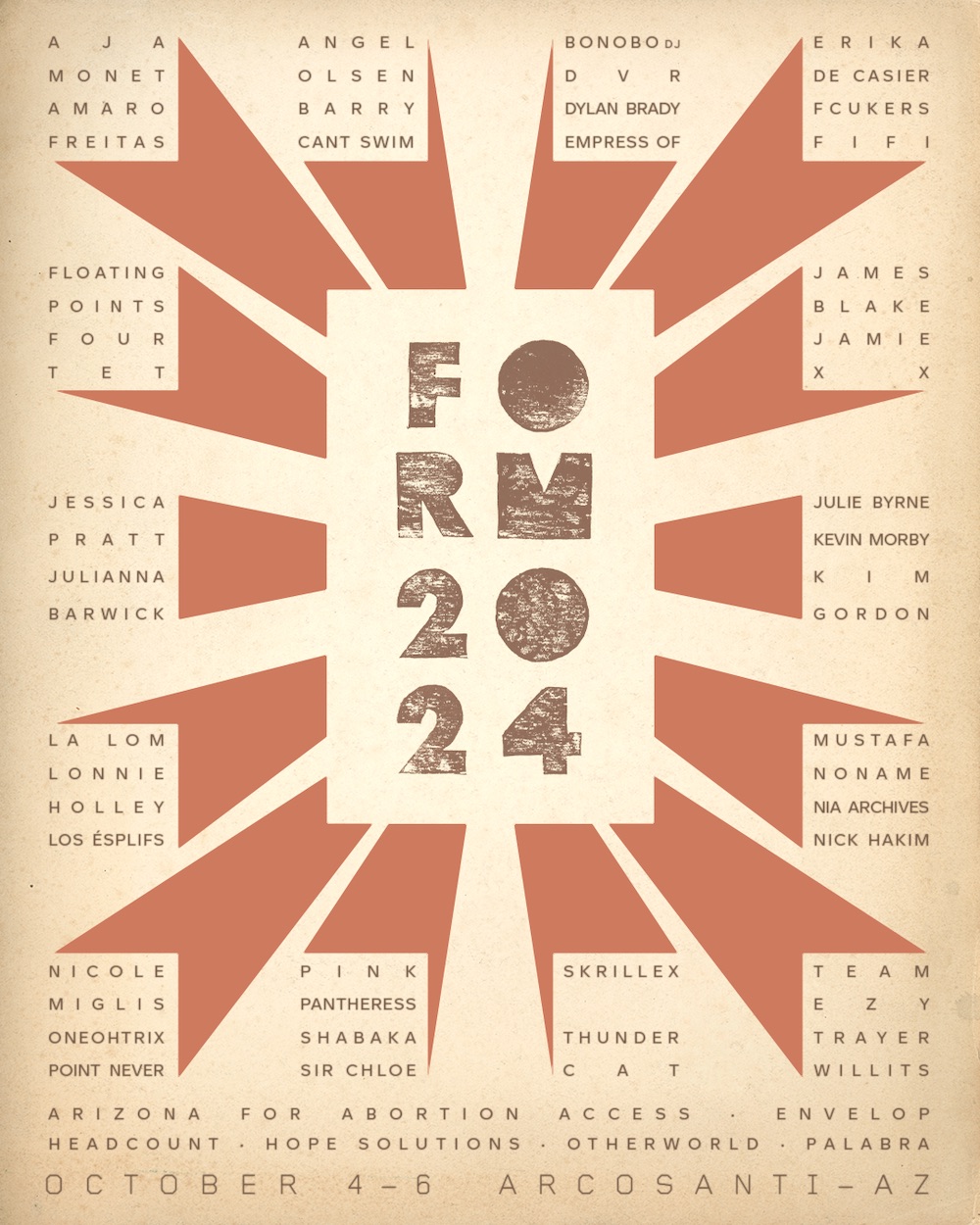 This time around, FORM Arcosanti is working with the consulting company Hope Solutions to reduce its carbon emission. There's no Hundred Waters on the bill, but singer Nicole Miglis, who recently released her first solo single, will perform. Since the poster isn't especially legible -- a real problem for festivals across the board lately -- you can check out the full alphabetical lineup below.