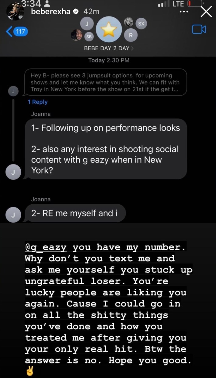 In a screenshot of a group chat, someone from her team asks Rexha if she's interested in shooting social content with G-Eazy. ("Me, Myself, & I" has gone viral on TikTok in recent weeks.) Over the picture, Rexha tagged G-Eazy and wrote: “You have my number. Why don’t you text me and ask me yourself you stuck up ungrateful loser. You’re lucky people are liking you again. Cause I could go in on all the shitty things you’ve done and how you treated me after giving you your only real hit. Btw the answer is no. Hope you good."