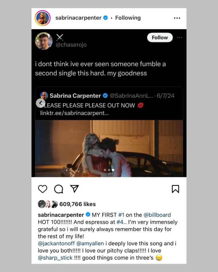 After debuting at #2 two weeks ago, "Please Please Please" drew 50.9 million official streams in the US between June 14-20, which made Carpenter’s best career streaming week for a song. The April single "Espresso," of which we are still big fans, got knocked down to #4 from its peak #3 spot.