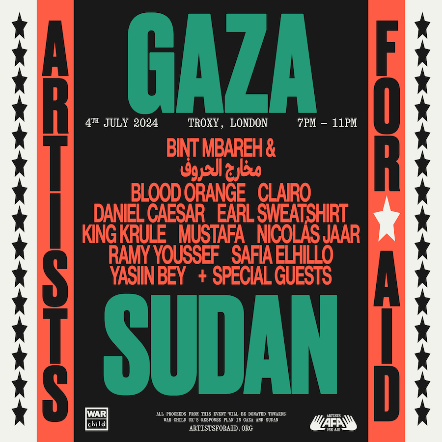 The London edition of Artists for Aid is going down next Thursday, July 4 at Troxy in London. This marks its second iteration, presented in partnership with the non-profit War Child to benefit humanitarian efforts in Palestine and Sudan. Blood Orange, Daniel Caesar, Nicolas Jaar, Ramy Youssef, Bint Mbareh, Yasiin Bey, and Mustafa himself also round out the lineup. You can grab tickets here.