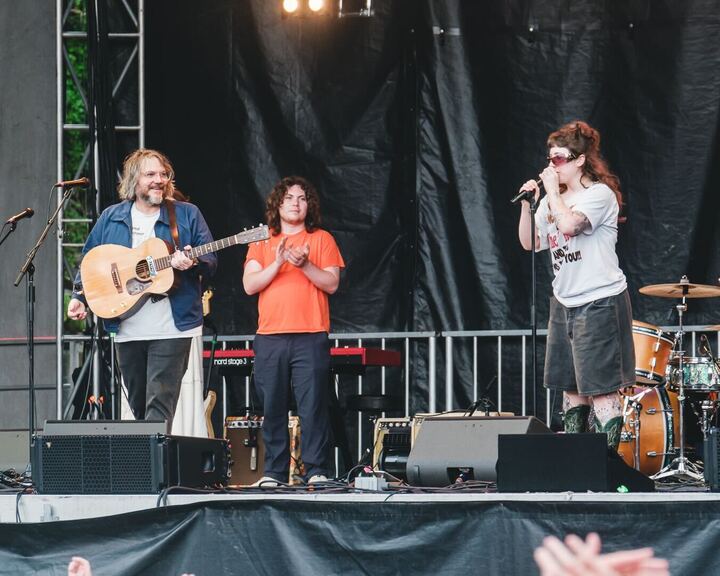 This past weekend was Wilco's Solid Sound Festival in Massachusetts. The band released their new EP Hot Sun Cool Shroud just as the fest was beginning, and their "deep cuts" set on Friday night was full of live debuts and rarities. Last night, the festival was shut down for about an hour because of the threat of lightning. Wednesday, who were scheduled to play that night, had to cancel their set. Wilco had already headlined the first two nights, and at that point, there was only one set left on the schedule: Jeff Tweedy & Friends. One of those friends was Wednesday's Karly Hartzman.