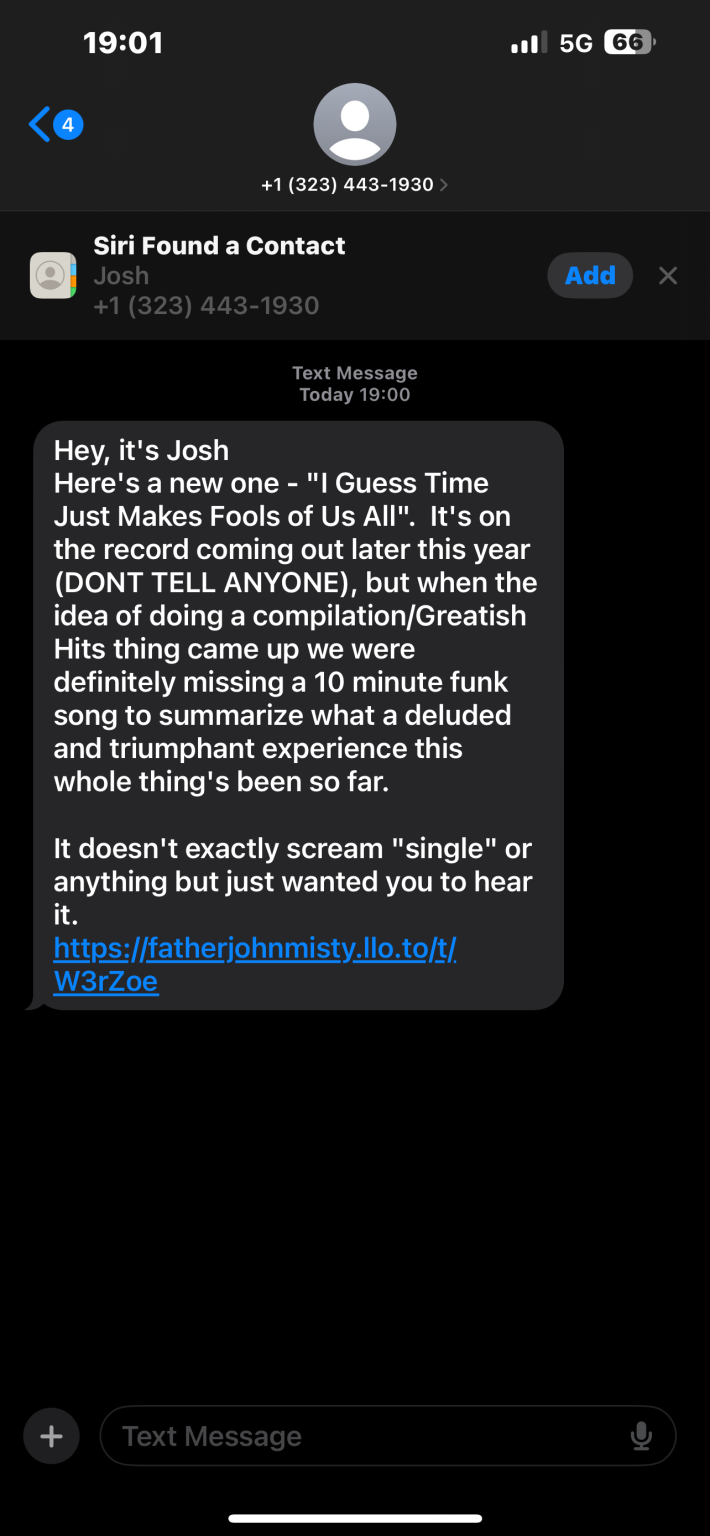 Cryptic king Father John Misty is up to something. Last month, the indie musician teased a song possibly titled "Josh Tillman And The Accidental Dose" and posted a minute-long clip of another track on YouTube, and today he texted a new single, "I Guess Time Just Makes Fools Of Us All," to fans who signed up for updates about his music.