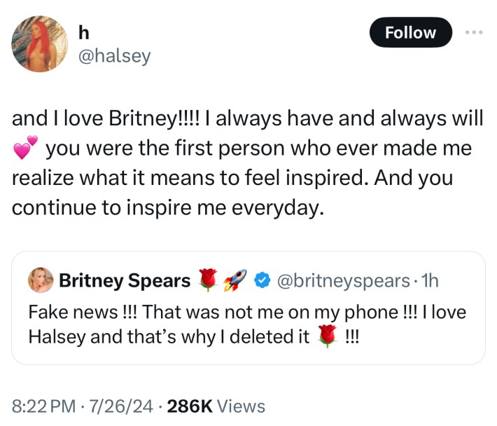 About fifty minutes after releasing her statement Spears deleted the tweet and posted another, claiming it had been "fake news" and "that was not me on my phone." She added, "I love Halsey and that’s why I deleted it !!!" Halsey responded, "I love Britney!!!! I always have and always will you were the first person who ever made me realize what it means to feel inspired. And you continue to inspire me everyday."