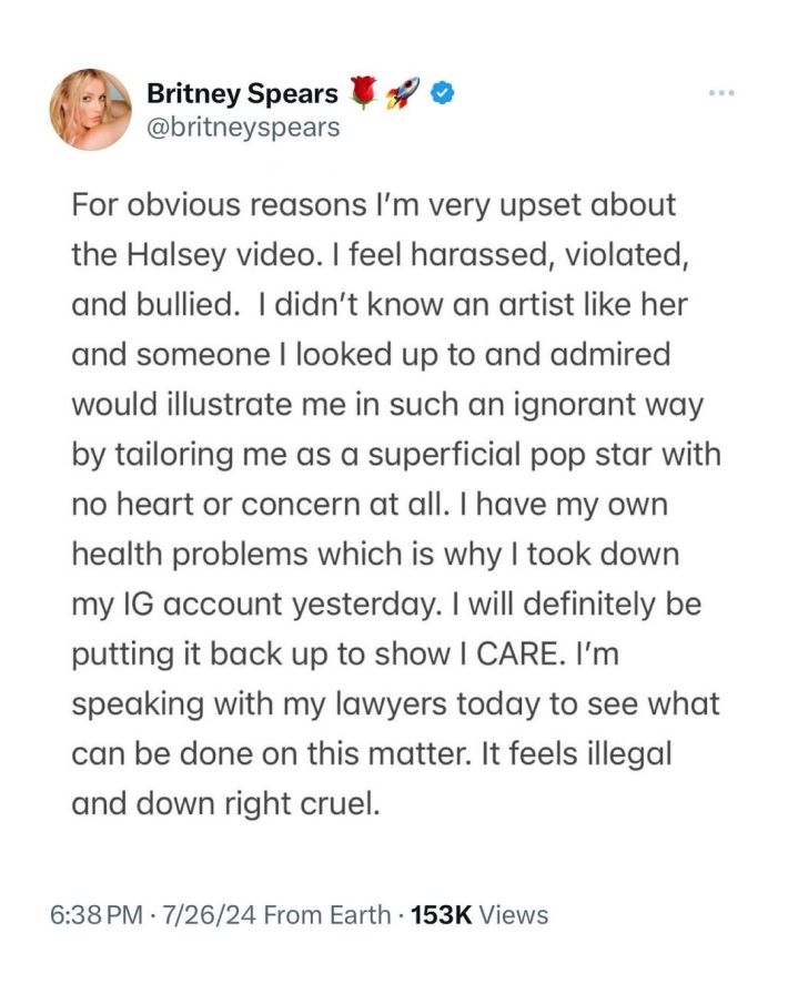 On Friday, Halsey unveiled her new single "Lucky," which samples Britney Spears’ 2000 song of the same title and Monica’s 1997 hit “Angel Of Mine.” She shared a music video, and Spears reacted to it on X with a since-deleted tweet saying she felt "harassed, violated, and bullied."