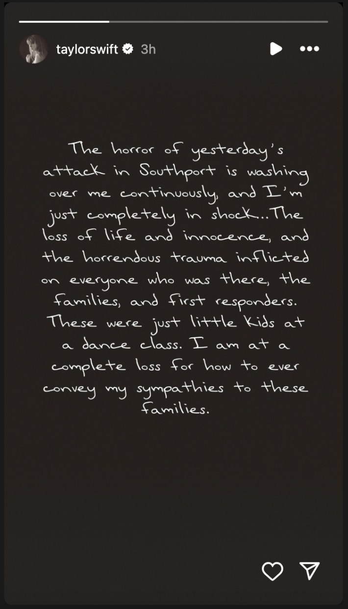 Three children died after a mass stabbing at a Taylor Swift-themed dance and yoga class in Southport, England on Monday. Swift shared a statement on her Instagram story Tuesday morning about the attack:
